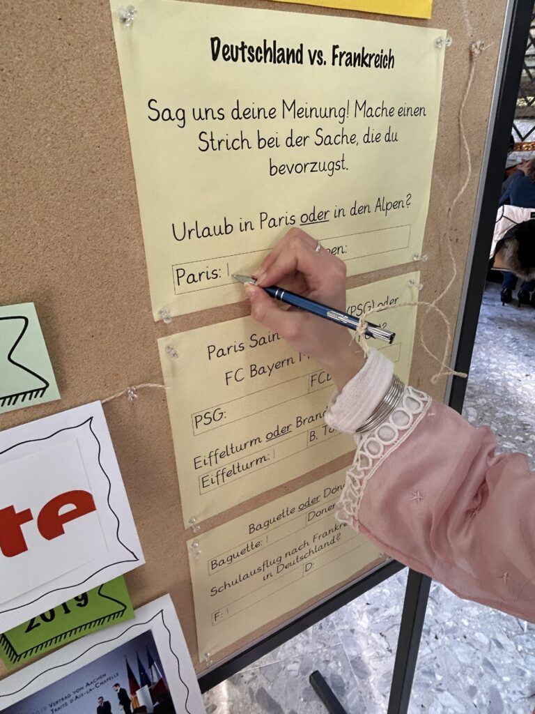 Der 22. Januar ist für Deutschland und Frankreich ein bedeutsamer Tag. Dies würdigt der Französisch-Grundkurs in diesem Jahr mit einem kleinen Projekt: Anlässlich des Tags der deutsch-französischen Freundschaft (fr. Journée de l’amitié franco-allemande) haben die Französisch-Schüler:innen des 11. und 12. Jahrgangs gemeinsam eine Stellwand gestaltet. Die kleine Ausstellung mit Informationen zu wichtigen Etappen der deutsch-französischen Freundschaft kann aktuell im Foyer der Schule begutachtet werden und lädt sogar zu einer kleinen Mitmach-Aktion ein.