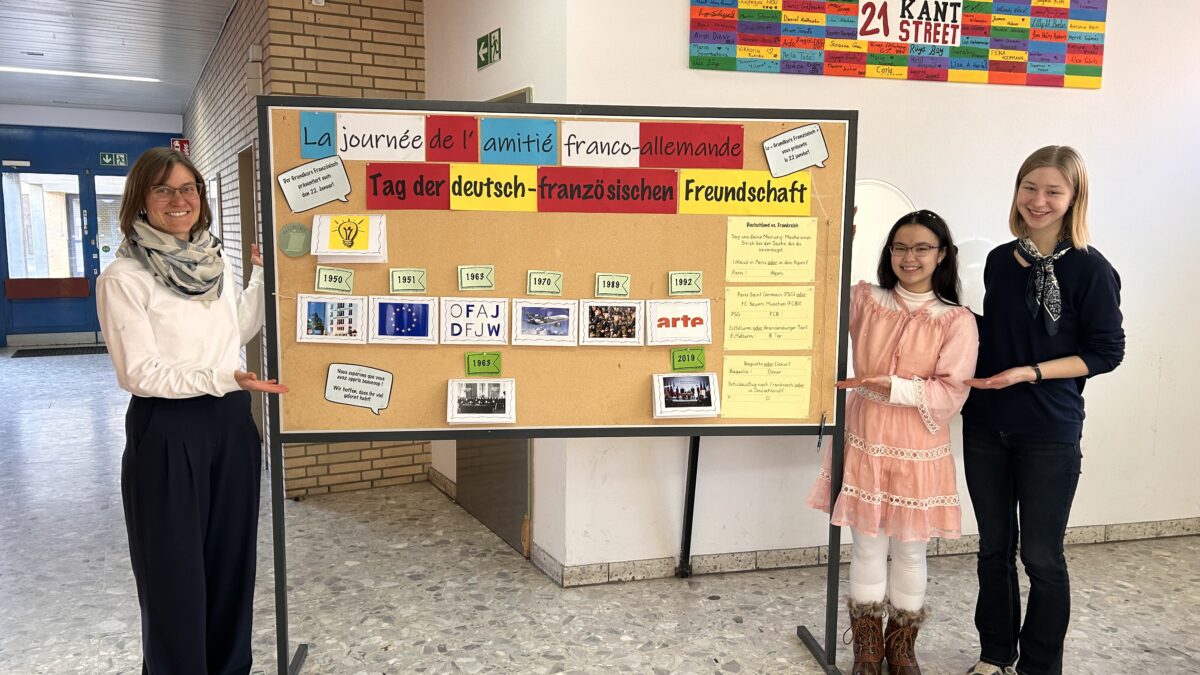 Der 22. Januar ist für Deutschland und Frankreich ein bedeutsamer Tag. Dies würdigt der Französisch-Grundkurs in diesem Jahr mit einem kleinen Projekt: Anlässlich des Tags der deutsch-französischen Freundschaft (fr. Journée de l’amitié franco-allemande) haben die Französisch-Schüler:innen des 11. und 12. Jahrgangs gemeinsam eine Stellwand gestaltet. Die kleine Ausstellung mit Informationen zu wichtigen Etappen der deutsch-französischen Freundschaft kann aktuell im Foyer der Schule begutachtet werden und lädt sogar zu einer kleinen Mitmach-Aktion ein.